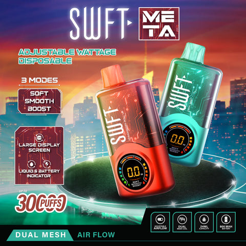 Talk about a classy vape, and that would be the SWFT Meta 30K. This solid-built disposable is a hell of a rugged device that delivers incredible MTL power—housing 24mL of e-liquid, with a promise of 30,000 puffs. Right on the front, you get an oval display that shows the ejuice and battery levels. SWFT Meta 30K is ideal for both first-timer vapers and veterans.