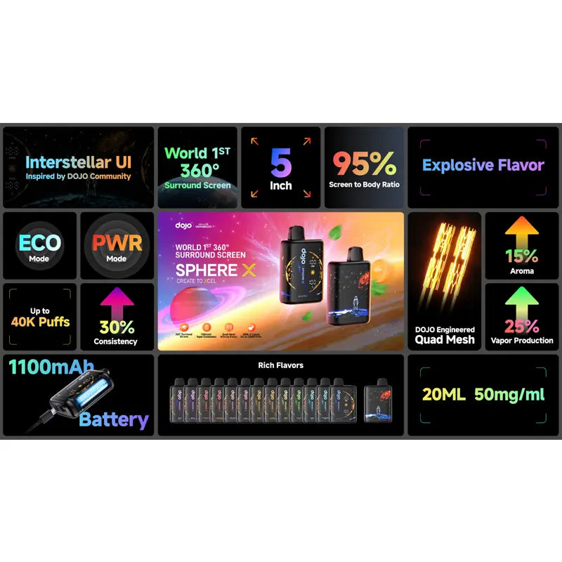 Vaporesso DOJO Sphere X is an advanced vaping device designed for a superior experience, featuring cutting-edge technology for enhanced flavor and performance. It comes with a powerful 1100mAh battery, intelligent voltage control, and a 360° surround screen, ensuring an unforgettable and customizable vaping journey.
