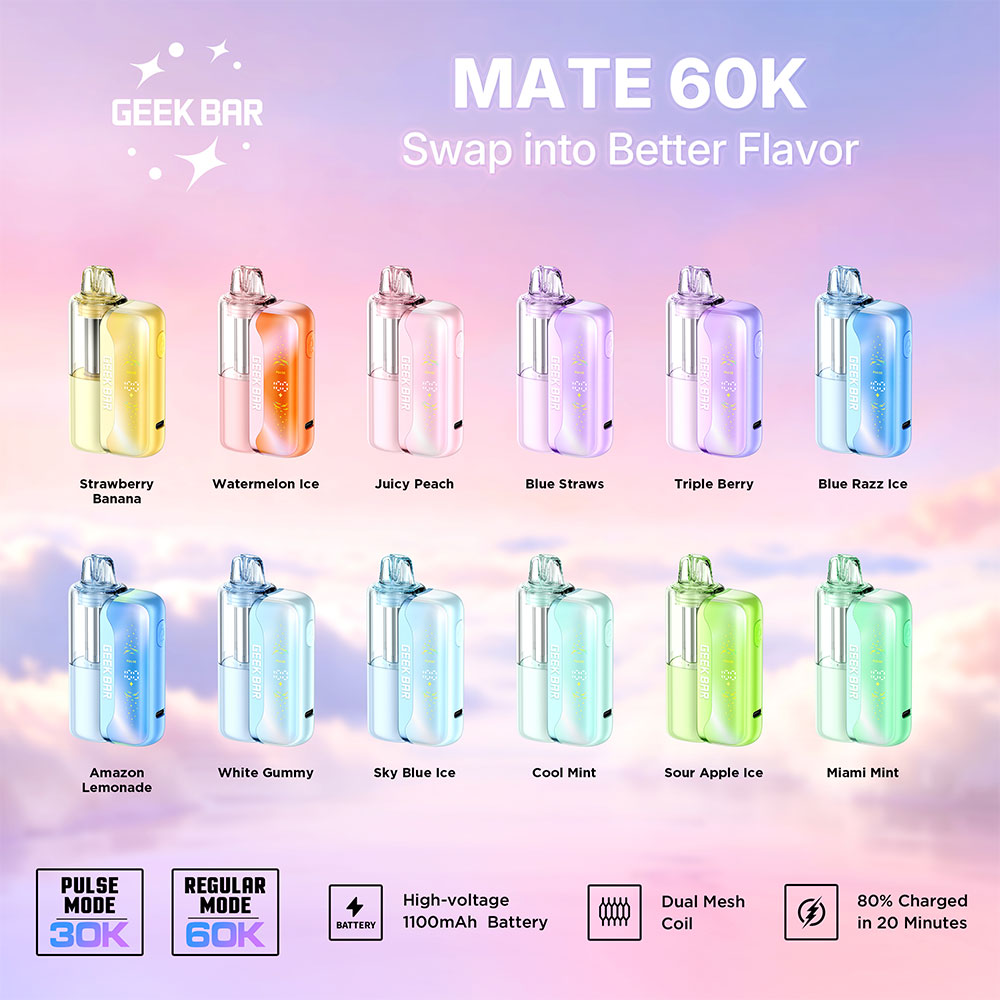 Discover the Geek Bar Mate 60K Kit is a sleek rechargeable vape with an 1100mAh battery, dual mesh coils, fast charging, and up to 60,000 puffs.