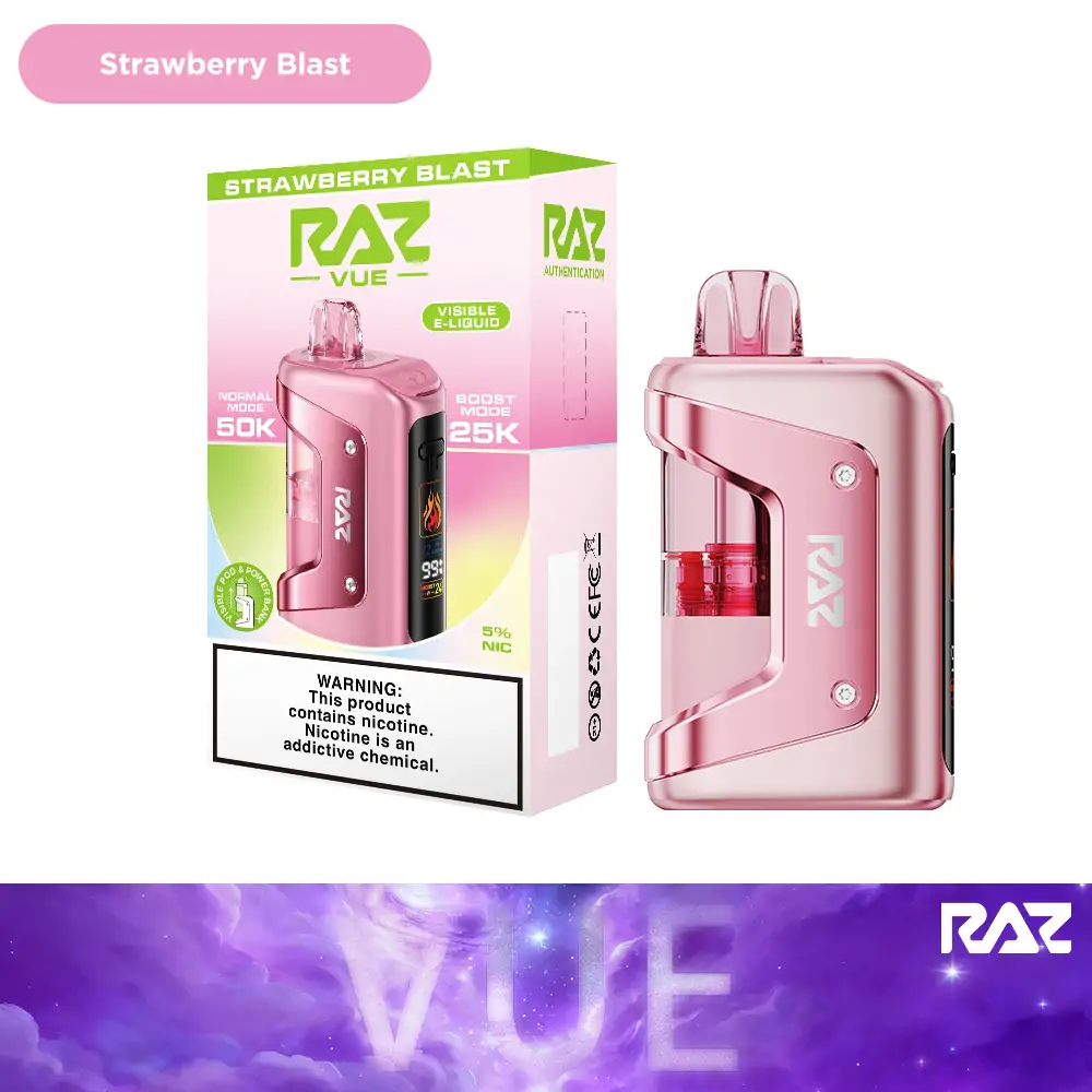 Powered by a combined 1320mAh battery system (900mAh device + 420mAh pod), the Raz Vue is designed to last longer than standard disposables — with up to 50,000 puffs in Normal Mode or 25,000 puffs in Boost Mode.