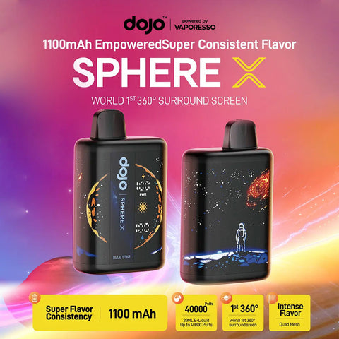 Rated for 40,000 puffs! The Dojo Sphere X 40k is one of those disposable vapes that offers the Baja Blast flavor. This flavor is DOJO’s Baja-style soda/tropical option, prefilled into the 20mL device, which runs on a powerful 1100mAh built-in rechargeable battery. The Sphere X offers two power modes: ECO and Power, with an intelligent voltage control feature.